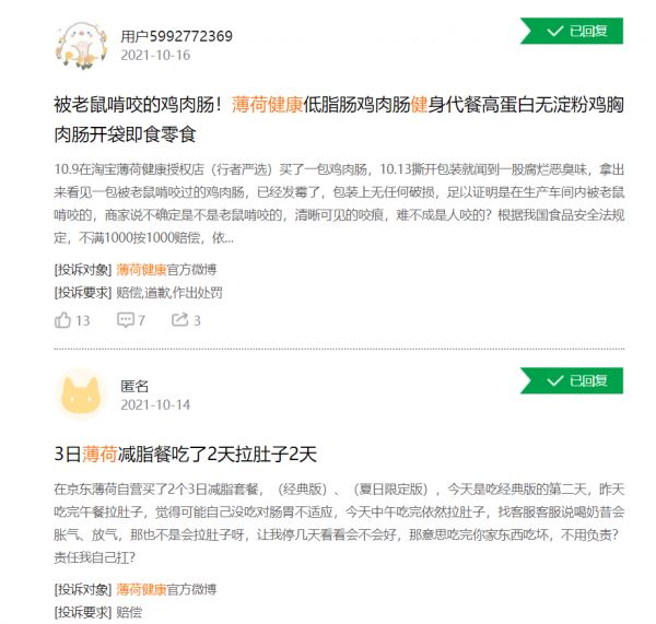 在黑猫投诉平台,也有多起消费者对薄荷健康的投诉。主要反映在食品安全以及会员退款等方面。