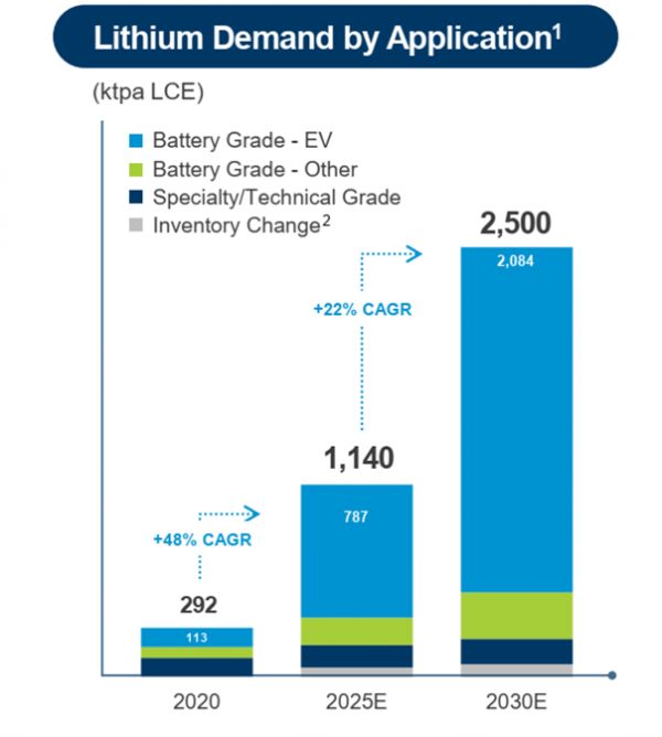 而从长远的需求出发,雅保公司预测至2030年,全球对锂的需求将达到2500千吨碳酸锂当量/年。2020年至2025年的复合增长率为48%,2026年至2030年的复合增长率为22%。