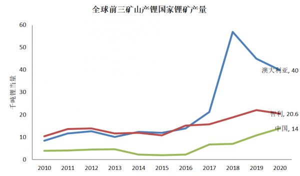 事实上,从全球范围来看,我国的锂资源并不突出。据BP能源统计,2020年全球矿山产锂的第一大国为澳大利亚,2020年产量为40千吨锂当量,其次为智利,2020年产量为20.6千吨锂当量,中国位列第三位,为14千吨锂当量。