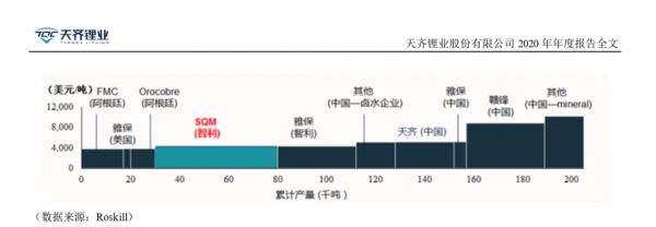 据天齐锂业在2020年报中转引Roskill的研究,全球各主要锂化工产品生产企业的碳酸锂提锂成本排名较前的受FMC(即Livent)、雅保和SQM这些海外企业控制,而天齐锂业和赣锋锂业所控制的锂资源开采成本都排名较为靠后。
