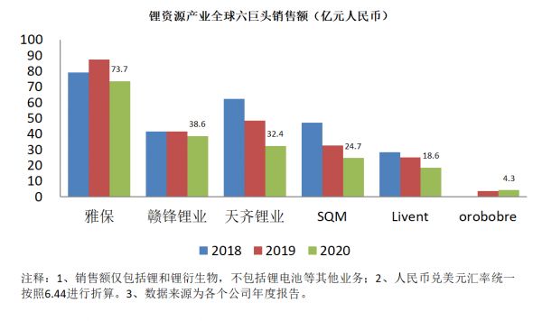 据相关上市公司披露数据,全球前六大锂资源公司分别为雅保、赣锋锂业、天齐锂业、SQM、Livent和orobore。这六家公司2020年度分别在锂矿及锂衍生物领域销售额达到73.7亿元、38.6亿元、32.4亿元、24.7亿元、18.6亿元和4.3亿元(人民币,人民币兑美元汇率以6.44进行折算)。