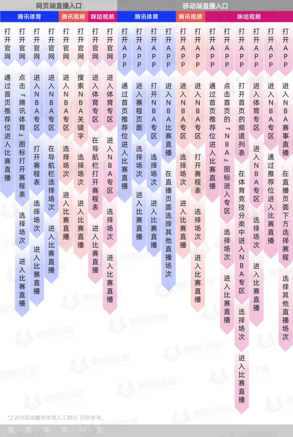 2020年7月初,在NBA新一个五年转播周期到来前,原本由腾讯体育负责的NBA业务转交给腾讯视频,其版权成本也将由腾讯视频承担。因此,腾讯在转播NBA赛事时能提供腾讯视频和腾讯体育两个入口。至于咪咕,与手中其他体育赛事版权一样,NBA赛事转播也被放在咪咕视频上。