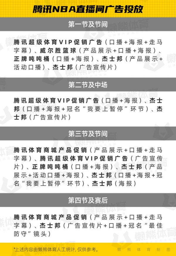 这种“单调”还体现在直播间的广告投放上。在腾讯的NBA直播间里,解说席上放着威尔胜的篮球,杰士邦和正牌吨吨桶也有很强的存在感,主持人还会为腾讯的超级体育VIP打广告。而在咪咕的NBA直播间里,除了背景海报上的“中国移动5G”和咪咕 NBA赛事转播开启的介绍之外,很难再看见其他广告元素。这一点同样是因为咪咕买的是联盟通版权,尽管可以插入广告,但因为全场次收费的机制,能吸引到的用户相对较少,广告方的投放意愿就没那么强。