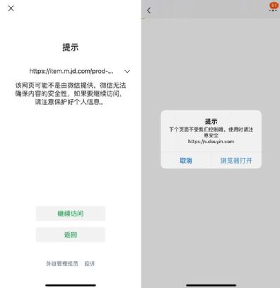 在工信部“互联互通”指导会议之后,微信率先做出了反应,在一对一聊天界面中开放淘宝、抖音等网址链接,但打开时需要经过二次安全确认,相当于增加了多一次的跳转。