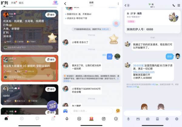 “它上面的青少年用户非常多,又在打社交的概念,老实说我是很担忧的。”这位家长表示,自己下载了TT语音后发现,在该产品的首页“扩列”模块,未成年用户数量较多,且多数涉及未成年人早恋情况并且极为严重——通过聊天发现,很多13、14岁的未成年人公开发帖找男友、甚至还有色情内容予以明显推荐位置显现。甚至有帖子发布隐晦信息,随后会引流至QQ进行涉黄服务。