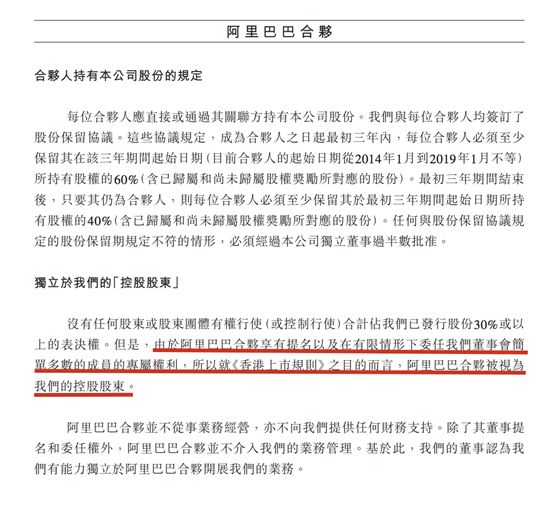 另一个案例就是阿里巴巴的合伙人制度。阿里巴巴招股书中写明:“根据《公司章程》,阿里巴巴合伙拥有提名(或在有限情况下委任)董事会简单多数成员的专属权利”,也因此,“就《香港上市规则》之目的而言,阿里巴巴合伙被视为我们的控股股东。”