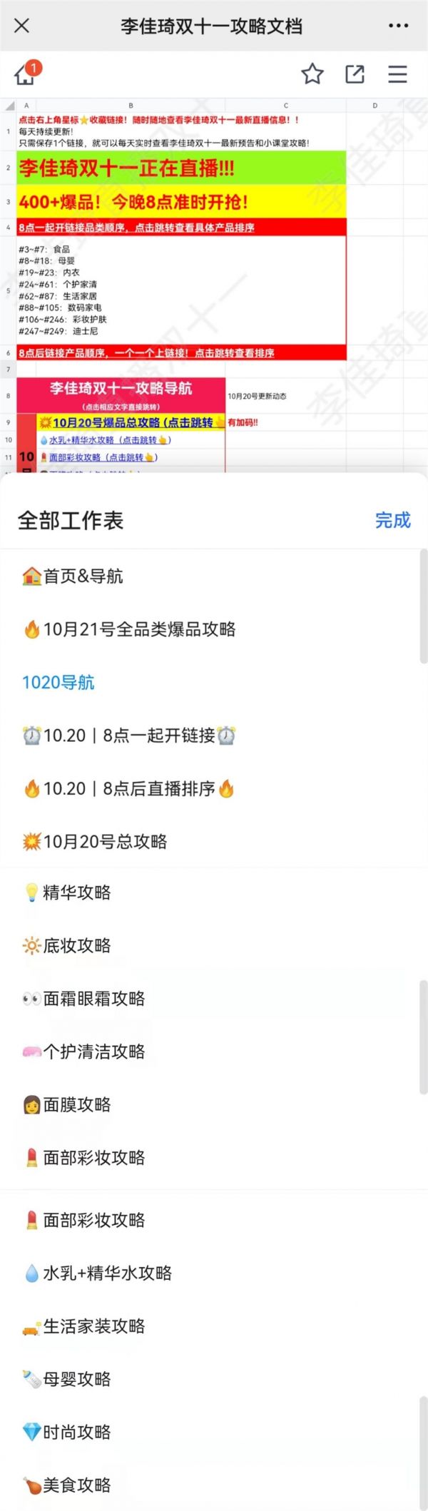 10月20号,李佳琦直播间一共上架439款产品,分为食品、母婴、内衣、个护家清、生活家居、彩妆护肤等至少八大品类。文档一共创建了16个Sheet工作表,包括首页/导航、1020导航、10.20 | 8点一起开链接、10.20 | 8点后直播顺序、10月20号总攻略以及各个产品品类的攻略等,且表格一直在持续更新。
