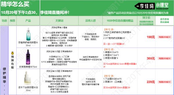 此外,不同于薇娅,李佳琦的攻略文档还格外创建了各个产品品类的攻略清单,包括精华攻略、底妆攻略、面霜眼霜攻略、个护清洁攻略、彩妆、水乳+精华水攻略等,从细分品类来看,护肤类和彩妆类,仍是李佳琦主要的带货产品。