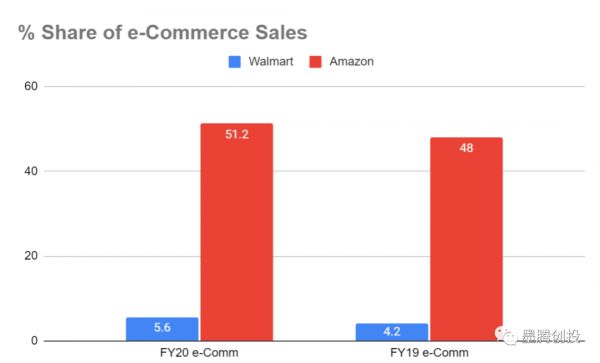 比较下,沃尔玛的电商只占到美国整体市场的5.6% - 亚马逊则超过了一半。