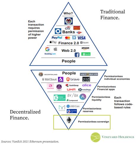 简单介绍一下(稍后我们还会回顾基础知识),以太坊是支撑去中心化金融 ( DeFi ) 运动的基础协议。通过DeFi,用户可以在没有银行等第三方的情况下进行点对点交易。以太坊还是非同质化代币 (NFT) 运动以及去中心化自治组织运动(DAO)的基础——前者为艺术品和证书等东西创造了数字稀缺性,后者则可以用新的方式组团来实现某些预设目标。