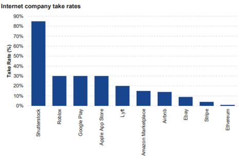 跟很多的互联网公司相比,以太坊的抽佣率要低得多(而且还在下降),增长速度是后者的数倍,而且是用类似的远期市销率进行交易,其PEG 为 0.03,相比之下,软件/金融平均水平约为2.5。
