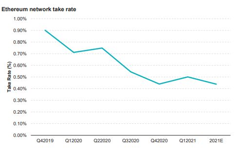 作为一项技术,以太坊面临着来自 Terra、DFINITY、Binance Smart Chain、Polkadot 、Cardano等公司的激烈竞争。每个竞争对手通常都会有一两件事情做得比以太坊更(一般是交易成本更低或每秒交易量更高)。这些团队都在快速成长、具有高度创新性、都很积极进取,资金都很充裕。但都没有规模跟以太坊接近的网络。这些协议的技术优势通常是特定流程中心化的结果,但确实建立在一个采用率要低得多的基础之上,而且(其中一些)节点成本要高得多。考虑到网络效应以及在后者平台上目前的创新数量,这些协议取代以太坊的可能性很低,而以太坊则通过Layer 2解决方案继续降低成本、降低抽佣率,提高吞吐量的趋势的可能性仍将继续,很难押注另一面。
