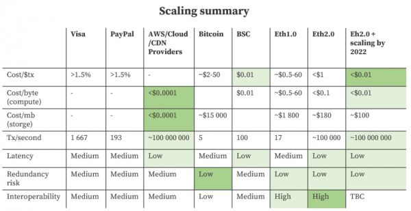 长话短说:以太坊2.0的推出和正在开发的扩展解决方案可让以太坊在未来 12-18 个月内达到具有竞争力的水平。在互操作性上,以及当交易需要绝对的有效性(比方说用于支付和价值转移)时的每笔交易成本方面,以太坊目前胜过所有的替代方案。