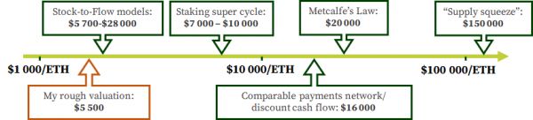 然后就是Pitch 的最后一部分,也就是估值,你会发现 很难给ETH估值。分析师估计的范围从5 700 美元/ETH(用比特币普及的stock-to-flow模型)到超过 150000 美元/ETH不等。