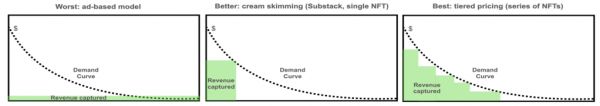 NFT 还有两个好处:一是支持细颗粒度的定价,而且(跟DeFi一样 )干掉了中介与传统分销商的寻租行为,这往往会此生大量的遗留成本。其结果是留给创作者的钱更多了,粉丝掌握的所有权更多了。创作者可以独立给 NFT 定价,用不同的价格和不同的媒介销售原版、限量版以及其他的副本。他们可能不再需要赞助,或者依赖类似 Patreon这样的支持,从而打开了新的商业模式的可能性。其中一种模式是销售NFT产生的版税,按照未来销售或类似 NFT 衍生销售的百分比来计算。