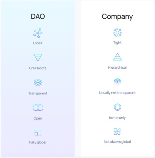 跟传统组织相比,DAO 的附加价值在于它的透明度、可访问性以及在很多情况下的自动化决策。由于区块链上的管理规则是透明的,人人都可以浏览任务以及对任务的奖励,检查财务状况并了解相关激励措施。由于 DAO 往往是全球性的,所以跟现有组织相比,DAO不受边境管制的限制,进入门槛比较低,转换成本也很低。如果一个 DAO 不能满足成员的需求,或者发展得太慢,成员可以迅速解散并组建/加入其他组织。最后,由于DAO本质上是基于规则的,所以是朝着AI 驱动型组织迈出的一步。当然,这是好事还是坏事还有争议,但直接的好处是硬编码的公正性。