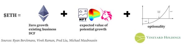 这里的估值把ETH的近似价值拆分为三个要素:没有增长的“核心业务”、保守的未来增长的预期价值以及以太坊所承载的“现实世界选项”的近似定价。