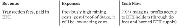 下面简要列出了以太坊的“损益表” 。收入增长是通过将以太坊的网络效应扩展到dApp与可交易性,从而增加了应计的交易费用。开支是目前出售的ETH来收回采矿的高昂能源成本。在PoS合并后,网络成本约占销售额的 1%,利润率(在这种情况下 FCF就是收益)可达 99%。