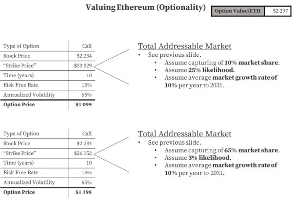 从理论上讲,用约2234 美元/ETH 的价格购买以太币买的是核心业务,预期的是以太坊最多有 15% 的机会占领它正在颠覆的所有市场的 5%的份额。用这个价位买入的话,你就是免费获得了可选择性。