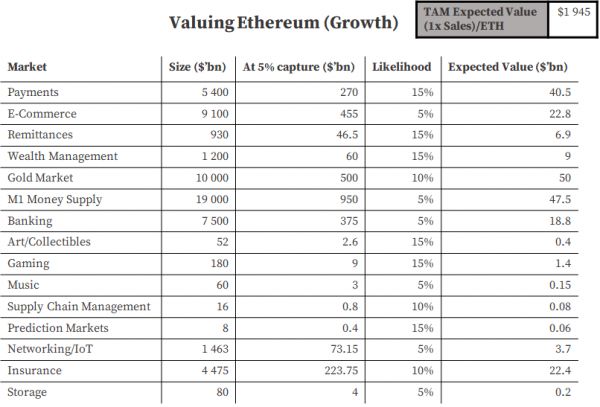 在判断增长时,可将其分解为以太坊可能会颠覆的行业,假设它占据了每一个市场的 5%,并为这种可能性分配一个概率,就可以得出未来增长潜力的预期值。这不是确切的估值,实际上甚至跟估值都不接近,但可以帮助把市场放在合适的背景下。行业之间有可能存在相当大的重叠,而且甚至拿到 5% 的份额所必需的路径依赖可能意味着结果比我在下面建模出来的要更加的二元化。如果以太坊不能拿下其中任何一个市场的 5%,就有可能在未来十年内逐渐消失。它会碰到一个吸收屏障。加上复杂的适配性意味着一个板块的采用(支付)会强烈影响到另一个(汇款)。反之,如果它在其中一个市场拿下的份额> 5%,最后所捕获的价值就有可能远远超过我在下面的粗算。