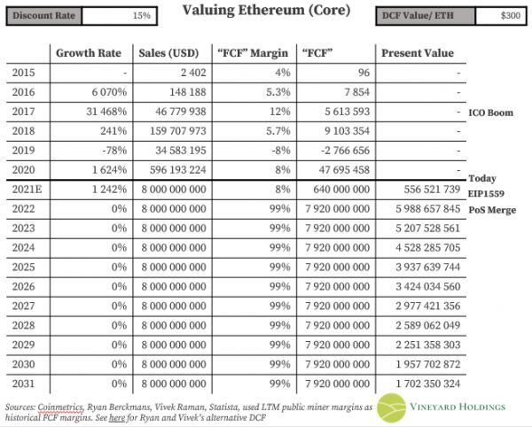 正如文章开头所提到那样,目前分析师给出的目标价格从5700美元到 150000 美元以上不等。跟随 Ryan 和Vivek的脚步,我大致估算了以太坊基于 DCF 的估值。