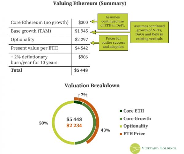 假设未来 10 年以太坊有部分的登月潜力,根据上述假设,以太坊嵌入的可选择性可粗略估计为 2297 美元/ETH。如此估值就可达到 4542 美元/ETH。加上未来十年预计有 2% 的通货紧缩供应消耗,以太币的内在价值目前可达 5448 美元/ETH。