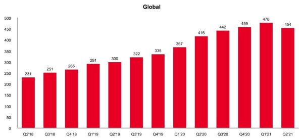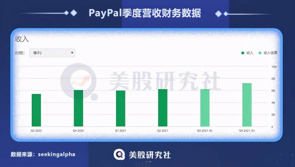 从PayPal近几个季度财务情况来看,营收增速放缓,增长幅度并不大,甚至个别季度有所下降。PayPal2020年Q3实现营收54.6亿美元,Q4营收61.2亿美元,2021年Q1营收60.3亿美元,Q2营收62.4亿美元。其环比增速分别为12.09%,-1.47%,3.48%。