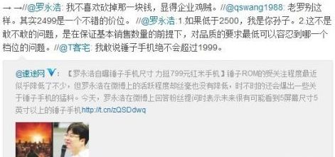 最后,会谈在一番尴尬的客套后结束,但罗永浩做手机的心却被点燃。2012年4月,罗永浩突然在微博宣布,要注册公司,做手机,从此正式踏上这条不归路。