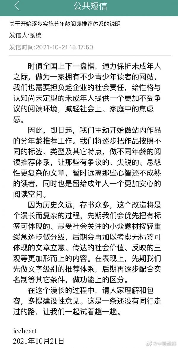 21日,晋江文学城发布站内信表示将逐步实施分年龄阅读推荐体系,按照作品不同标签、类型及其他特点,做不同年龄的阅读推荐,让有争议、尖锐的、思想性更复杂的文章,暂时远离心智不成熟的读者,同时留给成年人一个更安心的阅读空间。(中新经纬)