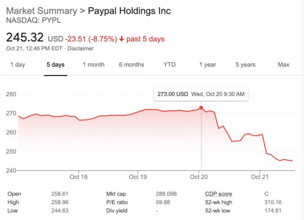 但消息发布后,PayPal的股价则发生了大幅跳水,两天内跌幅高达10%,市值跌破3000亿大关。