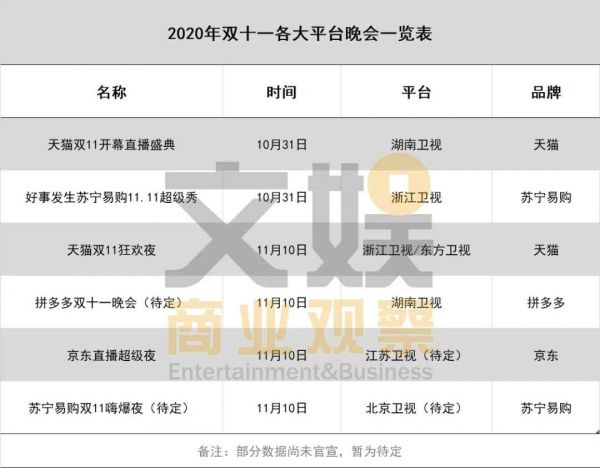 从2015年,天猫联合湖南卫视首创双十一晚会,开启中国电视史上首台电商晚会,到2019年,苏宁易购也加入了双十一战场,首度迎来了正面交锋,再到2020年,双十一主题晚会已经增至六台,竞争激烈的同时,同质化也逐渐严重。
