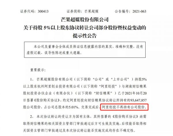 公告显示,股东阿里创投拟向财信精果协议转让5.01%股份,股份转让价格为47.56元/股,转让总价款44.5亿元,本次协议转让的受让方为国有主体;交易完成后,阿里创投不再持有芒果超媒股份。