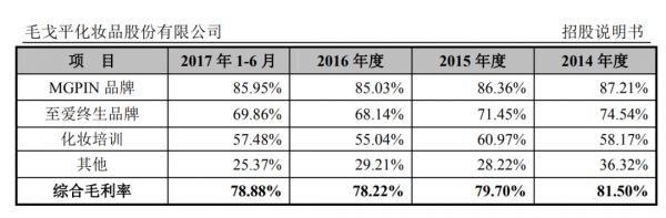 毛戈平最新招股书公布于2017年9月,据招股书显示,在2014至2017年上半年,MGPIN营收占比分别为71.61%、69.23%、74.16%、72.80%,至爱终生营收占比分比为17.42%、16.38%、11.16%、11.31%,化妆培训营收占比分别为9.52%、12.64%、12.64%、13.64%。由此可以看到,MGPIN几乎每年都占主营收的7成左右。