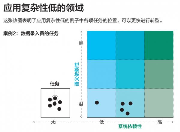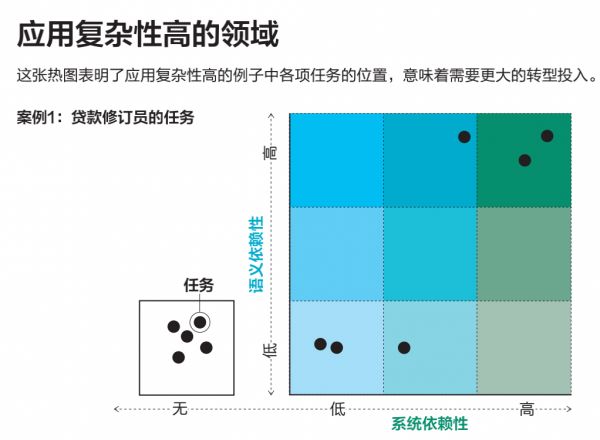 我们为银行案例的两类工作绘制了复杂性热图。贷款修改人员需要完成的许多任务都具有较高的应用复杂性(参见图表“应用复杂性高的领域”),表明该领域的转型投入要大于数据录入类的低难度领域(参见图表“应用复杂性低的领域”)。