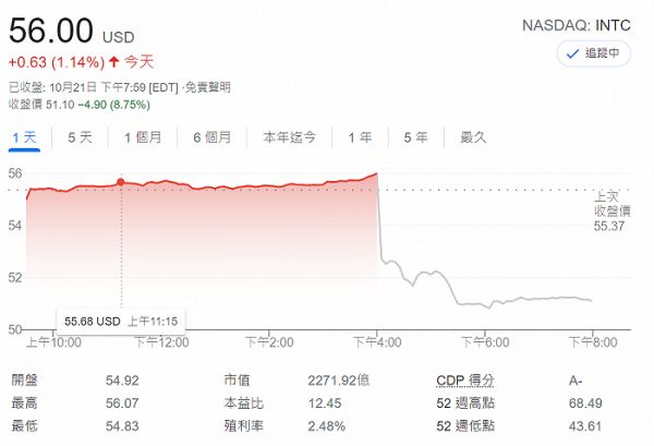 英特尔第三季度营收191.92亿美元不及预期,盘后一度重挫9%