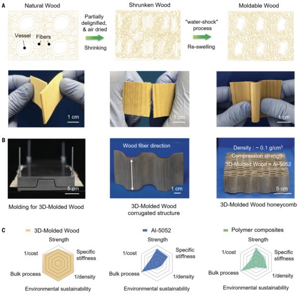 图|通过部分脱木素与“水冲击”工艺相结合的褶皱细胞壁工程策略,使木材更坚固和可模塑。(来源:Science)