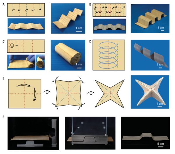 利用这种细胞壁工程方法,研究人员可以通过机械弯曲、折叠和扭转将可模塑木材加工成各种形状,当达到目标结构时,干燥木材就能固定其形状,优异的折叠性和干燥后的稳定性使木头能够设计和制造复杂的 3D 结构。