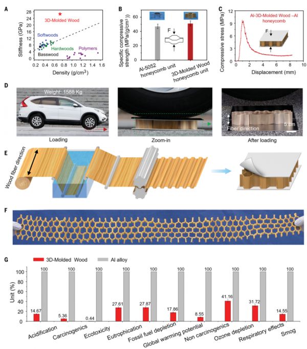 一个例子是蜂窝结构,它通常由聚合物或金属(如 Al-5052 合金)制成,3D 模制木质蜂窝单元的比抗压强度(51.6 MPa/g/cm³)与 Al-5052 蜂窝单元的比抗压强度(46.8 MPa/g/cm³)相当,但成本更低更环保。