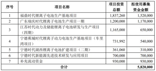 此次582亿元的募资计划中,有489亿元花在5个电池生产项目与1个技术研发项目上,另外还募集了93亿元的补充流动资金。