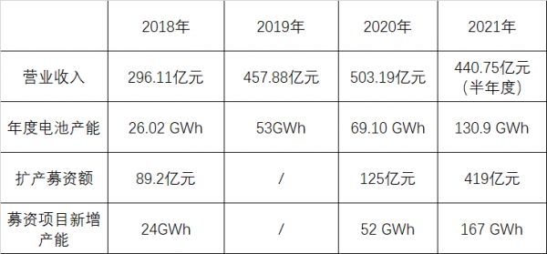 此次宁德时代再次发起“翻倍式扩产募资”,对于募资规模的要求也翻了个倍,本次募资计划中仅与生产相关的项目募资额就达到了419亿元,几乎追平2021年上半年的营业收入。