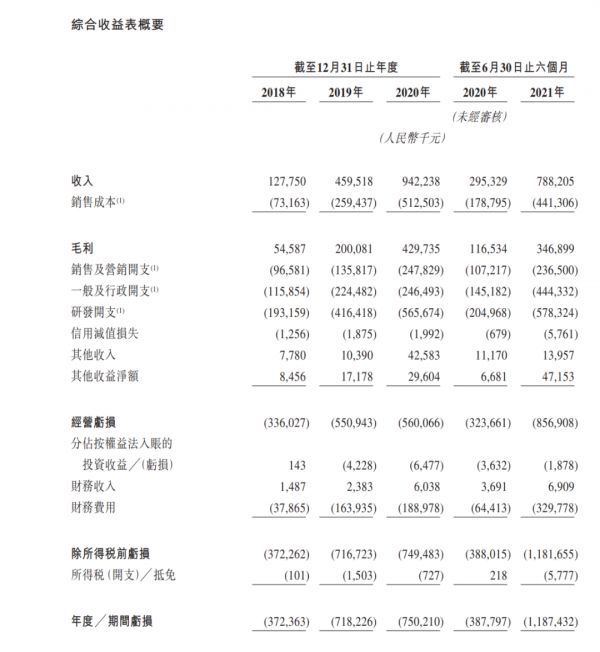 招股书显示,2018年-2020年,其营收分别为1.28亿元、4.6亿元、9.42亿元;同期的毛利分别为5459万元、2亿元、4.3亿元。而如果加上各种成本,这三年以及截至2021年上半年,分别产生亏损净额3.72亿元、7.18亿元、7.5亿元及11.87亿元,三年半累计亏损30亿。