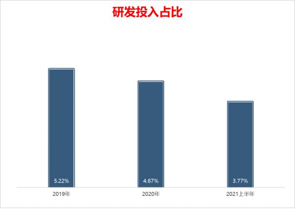 据公开资料显示,科沃斯2021年上半年,研发费用为2.02亿元,占营收的比例为3.77%,2019~2020年的研发投入占比分别为5.22%、4.67%,呈现逐年下降的趋势;销售费用为12.18亿元,同比增长130%,占营收的比例为22.73%,与研发投入形成了鲜明的对比。