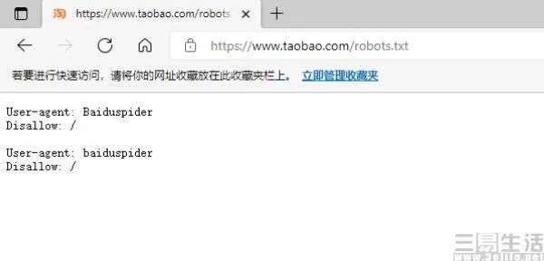 我们以淘宝的“https://www.taobao.com/robots.txt”为例可以看到,这家电商网站采用的robots协议其实非常简单,“User-agent”主要作用是告诉网站服务器,访问者是通过什么工具来请求的,而后面的“Baiduspider”就是大名鼎鼎的百度搜索引擎蜘蛛,而最后的“Disallow: /”,按照robots协议的规则,是禁止被描述的搜索引擎蜘蛛(百度)访问网站的任何部分。