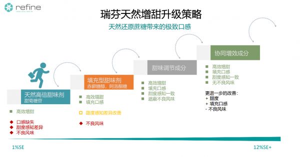 在创始人王晓韵看来,目前中国大部分消费者已基本经历从对减糖饮食具备一定认知,到产生诉求,再到消费转化的过程,下一步就是对于甜味剂天然、健康、安全的关注,认知进入到2.0,自然也就需要2.0的技术来支撑。「瑞芬生物」提出四层稳态模型,以天然高倍甜味剂作为底层实现,二层天然填充型甜味剂,三层甜味增强,四层协同,最后实现纯粹的、天然的、最小化添加量清洁标签型的代糖方案。