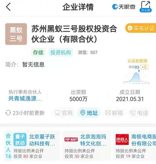 根据公开资料显示,10月19日,苏州黑蚁三号股权投资合伙企业(有限合伙),新增字节跳动关联公司北京量子跃动科技有限公司、北京泡泡玛特文化创意有限公司、南极电商、谦寻(天津)企业管理合伙企业(有限合伙)等多名股东。其中,前者为专注消费领域投资的黑蚁资本。