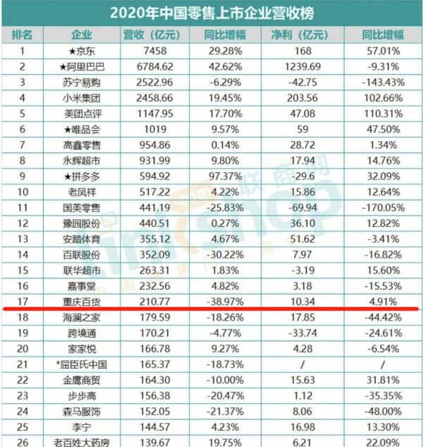 在《2020年中国零售上市企业营收榜》上,200亿可以排在17-18名的位置,南京的金鹰百货都去过吧?一年卖的还没李佳琦和薇娅一晚上的GMV多,联华超市各个城市都有吧?一年也就刚比两位主播卖得多一点点。