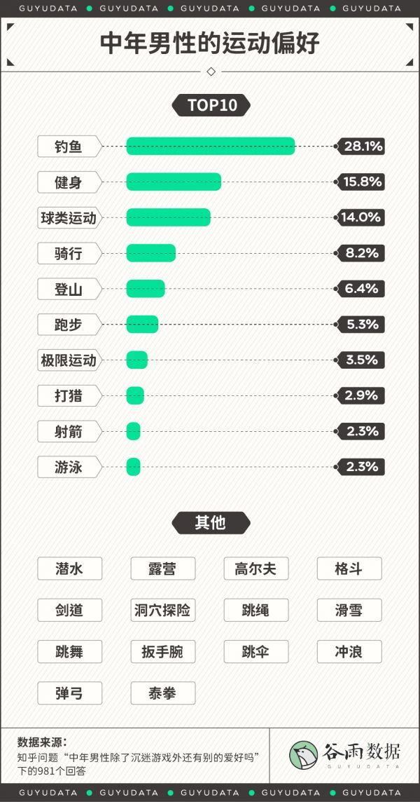长期以来,钓鱼由于其消耗体力相较其他运动类别较低,故而被视为中老年男性闲暇之余消磨时光的不二之选。根据谷雨数据调查显示,钓鱼在中年男性运动偏好Top10排行榜上,以28.1%的得票率高居榜首。