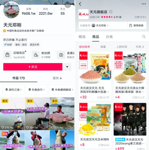 随之而来,一大批钓鱼达人在短视频平台上快速崛起。以中国钓鱼运动协会技术推广总教练邓刚为例(抖音账号:天元邓刚),从2019年10月其第一条视频至今,仅仅两年时间便已坐拥2千万粉丝。此外诸如“刘志强钓鱼”、“职业钓手曾晖”等头部账号,粉丝数量也均已突破百万大关。据相关数据统计,邓刚的账号直播带货30天的销售额可达到295万元。