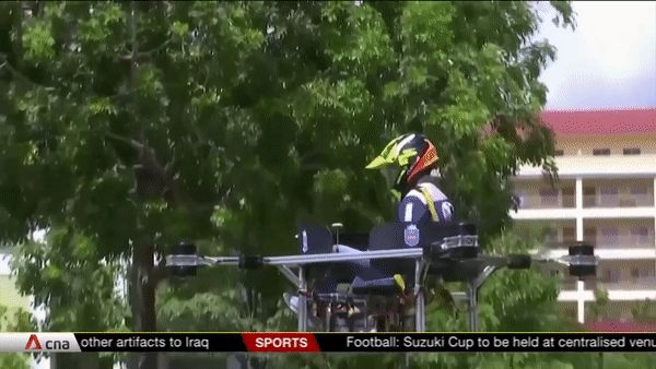 在一段长达一分钟的镜头里,该名男子坐在四个铝箍之间,每个箍串起18个2英尺长的螺旋桨。然后,飞行员乘着无人机起飞,在空中盘旋了一会儿,和手工艺品然后从草坪上升起,盘旋一下,随后降落在了原地。