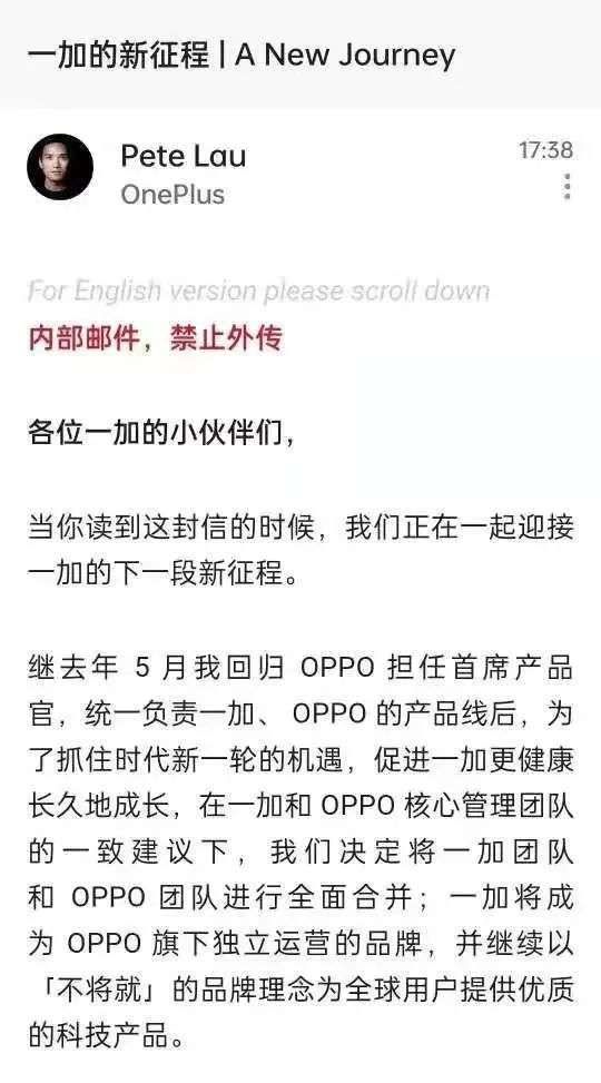 一加创始人刘作虎发布了一封内部信,在信中他表示:“为了抓住时代新一轮的机遇,促进一加更健康长久地成长,在一加和OPPO核心管理团队的一致建议下,我们决定将一加团队和OPPO团队进行全面合并;一加将成为OPPO旗下独立运营的品牌。”